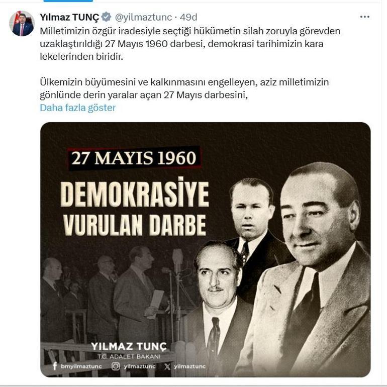 Adalet Bakanı Yılmaz Tunç, 27 Mayıs darbesine ait, “Üzerinden yıllar geçse de demokrasimizin yaşadığı bu acı tecrübeyi hiçbir vakit unutmadan her türlü vesayet anlayışına karşı demokrasimizi müdafaaya, ulusal iradeyi her şartta üstün tutmaya, hukuk devleti unsurunu güçlendirmeye devam edeceğiz.” sözünü kullandı.