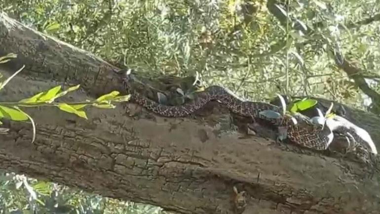Bursa’nın İznik ilçesinde zeytin ağacının üstünde görülen 2,5 metre uzunluğundaki yılan cep telefonu kamerasına yansıdı.