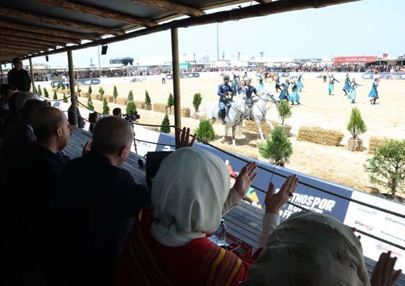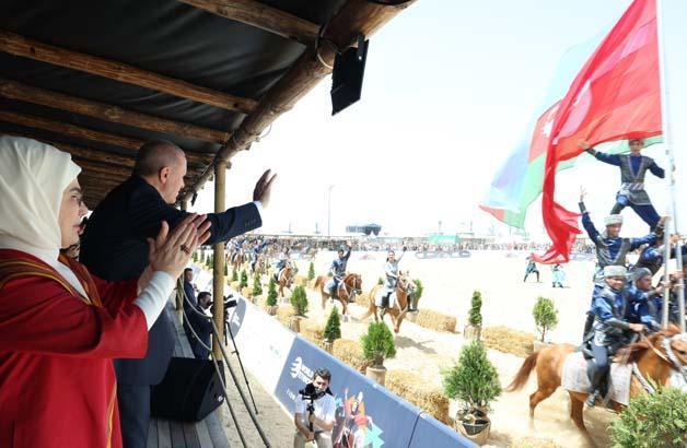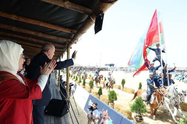 Festival alanında yöresel oyunları da izleyen Erdoğan, Karabağ’dan gelen takımın akrobatik at gösterisi sırasında Türk ve Azerbaycan bayrağını açtığı anları ayakta alkışladı.