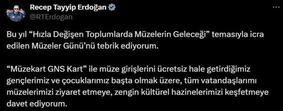 “Bu yıl ‘Hızla Değişen Toplumlarda Müzelerin Geleceği’ temasıyla icra edilen Müzeler Günü’nü tebrik ediyorum. ‘Müzekart GNS’ ile müze girişlerini fiyatsız hale getirdiğimiz gençlerimiz ve çocuklarımız başta olmak üzere, tüm vatandaşlarımı müzelerimizi ziyaret etmeye, güçlü kültürel hazinelerimizi keşfetmeye davet ediyorum.”
