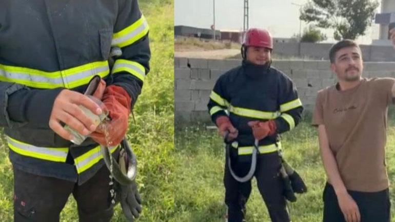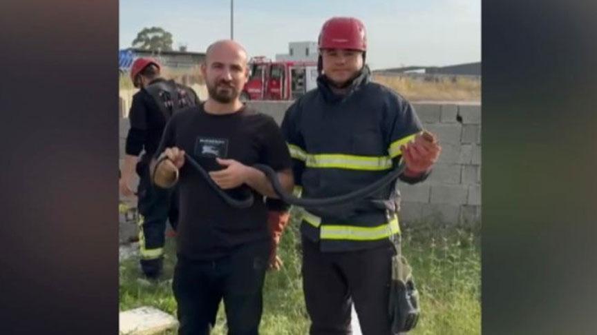 Bahçeye giren bir buçuk metrelik kara yılanı yakalayan itfaiyeci, yılana su içirirken, vatandaşların yılanla hatıra fotoğrafı çektirdiği anlar kameralara yansıdı. Yılan, daha sonra doğal ömür alanına bırakıldı.
