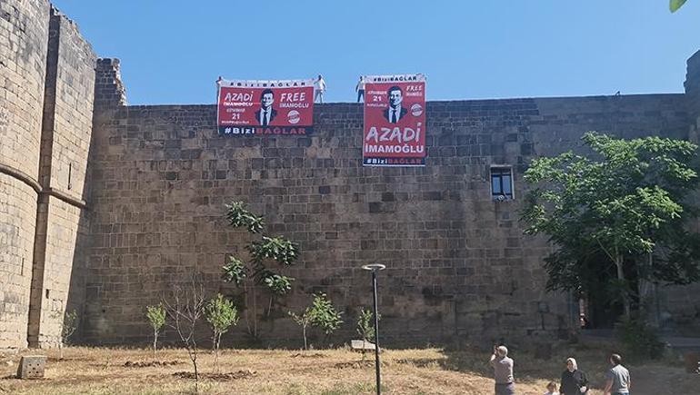 CHP’liler, Silivri’deki Marmara Kapalı Ceza İnfaz Kurumu’nda tutuklu bulunan Ekrem İmamoğlu için sabah saatlerinde Diyarbakır surlarına üzerlerinde ‘Azadi İmamoğlu’ ve ‘Free İmamoğlu’ yazılı pankartlar astı.