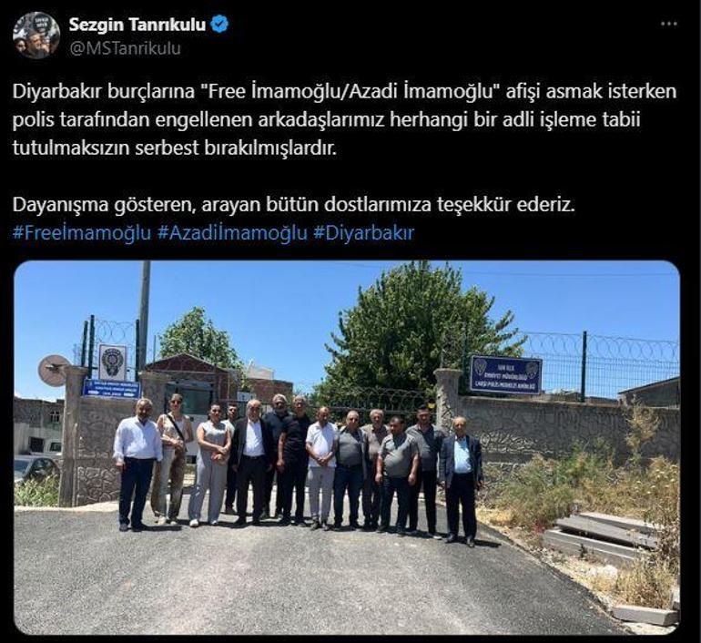 CHP Diyarbakır Milletvekili Sezgin Tanrıkulu da X hesabından yaptığı paylaşımda, “Diyarbakır burçlarına ‘Free İmamoğlu/Azadi İmamoğlu’ afişi asmak isterken polis tarafından engellenen arkadaşlarımız rastgele bir isimli sürece natürel tutulmaksızın hür bırakılmışlardır. Dayanışma gösteren, arayan bütün dostlarımıza teşekkür ederiz” dedi.