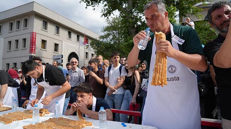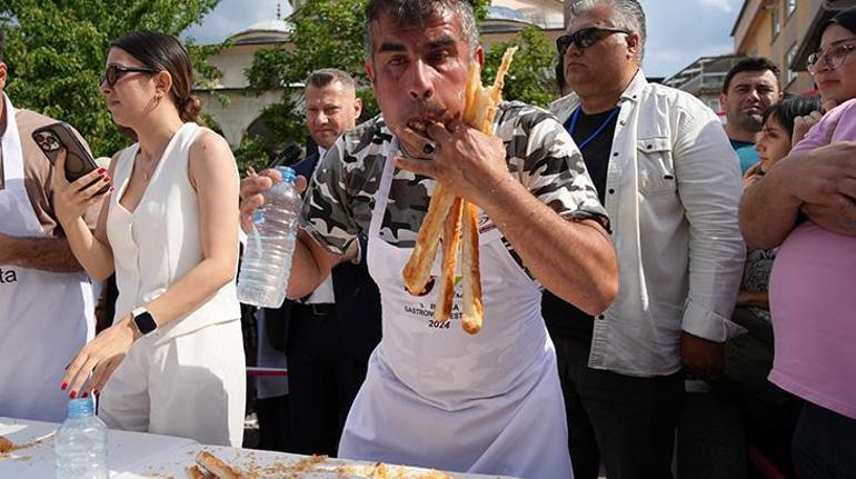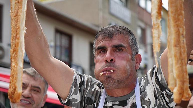 Zaman vakit baygınlık düzeyine gelen yarışmacılar başlarından aşağı su döküp börek yemeğe devam etti. Renkli imgelere sahne olan börek yeme yarışında birinci ikinci ve üçüncü olan yarışmacılar tıpkı uzunlukta 11’er metre börek yiyince devreye hassas terazi girdi.