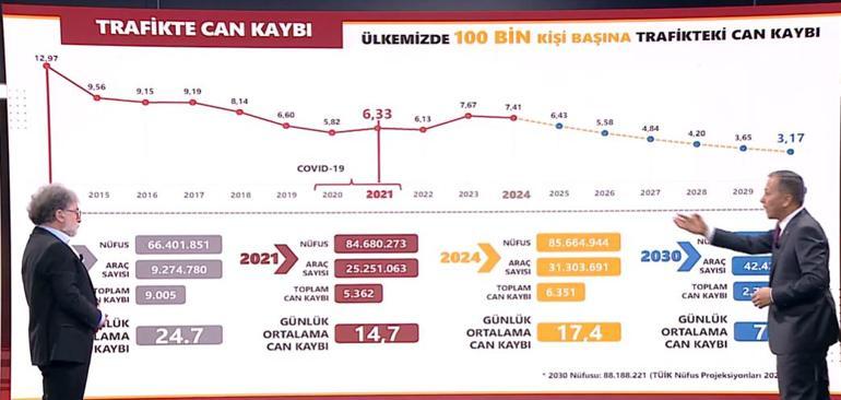 2021-2022’de epey hoş düşüşler vardı. Lakin sonra bir anda bu tekrar üste gerçek çıkmaya başladı. Bizim de bir kelamımız var. Sayın Cumhurbaşkanımızın Milletin Evi Külliye’de vatandaşlarımıza bir kelamı var. 2021’in Şubat ayında Sayın Cumhurbaşkanımız bir genel yayınladı. İnançlı Trafik İnançlı Türkiye mottosuyla dedi ki tıpkı Birleşmiş Milletleri’n tavsiyesi bütün ülkeler olduğu üzere orada 2020’nin Kasım ayında dediler ki biz 10 yılda 2030’a kadar dünyada trafikten sebep can kayıplarını %50 düşürmemiz lazım. 2050’de de bunu sıfırlamamız lazım. Bununla ilgili bakanlar doruğu yapıldı.