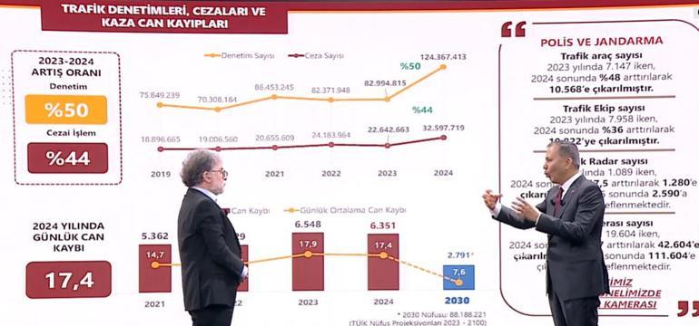 1 yılda kontrolü yüzde 50 artırdık. Ceza sayısını yüzde 44 artırdık 10 milyon ceza yazdık. 10 milyon süreç yapmamıza karşın 197 kişiyi kurtarabildik. Trafikte araç sayımızı yüzde 48 artırdık. Grup sayısını yüzde 36 artırdık. Radar sayısını 2023’ten bu yana yüzde 17,5 artırdık.