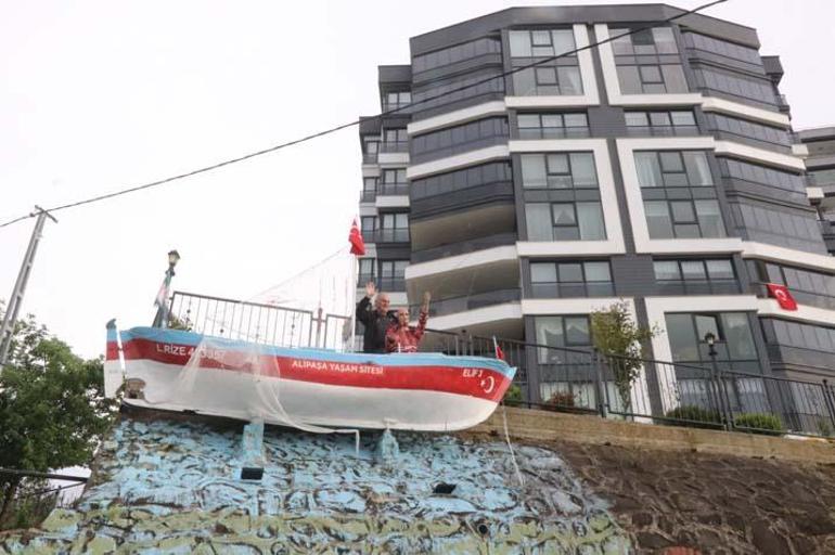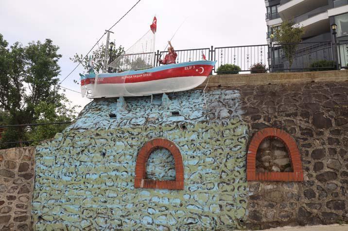 Süleyman Sinal, kıyıdan kamyona yükletip yaşadığı sitenin önüne getirdiği kayığı, vinç yardımıyla yaklaşık 3 metre yükseklikteki istinat duvarının üzerine özel düzenekle monte ettirdi.