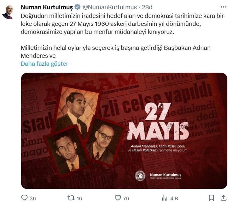 3. Meclis Başkanı Kurtulmuş’tan, 27 Mayıs 1960 darbesi paylaşımı