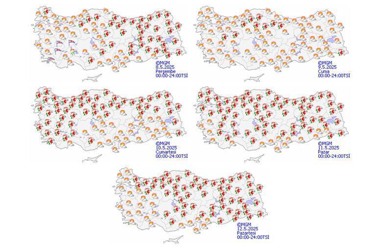 Meteoroloji Genel Müdürlüğü tarafından yapılan iddialara nazaran: Ülkemiz genelinin modüllü ve çok bulutlu, Akdeniz’in Toroslar mevkii, İç Anadolu’nun doğusu, Karadeniz, Doğu Anadolu ile Kırklareli, Edirne, Sakarya, Kahramanmaraş, Karaman, Çankırı, Adıyaman, Diyarbakır, Batman ve Siirt etrafları ile Antalya’nın batısının iç kesitlerinin sağanak ve gök gürültülü sağanak yağışlı geçeceği varsayım ediliyor. Yağışların, Çorum, Amasya ve Tokat etrafları ile Samsun’un ve Ordu’nun iç bölümlerinde mahallî kuvvetli olması bekleniyor. Güney Ege ve Batı Akdeniz’de toz taşınımı görüleceği varsayım ediliyor.