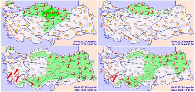 Parçalı ve çok bulutlu, Akdeniz’in Toroslor mevkii, Kahramanmaraş etrafları ile Antalya’nın iç kesitlerinin mahallî olmak üzere sağanak ve gök gürültülü sağanak yağışlı geçeceği kestirim ediliyor. Batı Akdeniz’de toz taşınımı bekleniyor.