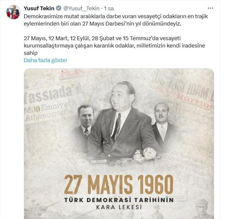 Bugünün, demokrasiye mutat aralıklarla darbe vuran vesayetçi odakların en trajik aksiyonlarından biri olan 27 Mayıs darbesinin yıl dönümü olduğunu anımsatan Tekin, “27 Mayıs, 12 Mart, 12 Eylül, 28 Şubat ve 15 Temmuz’da vesayeti kurumsallaştırmaya çalışan karanlık odaklar, milletimizin kendi iradesine sahip çıkma azmi ve kararlılığı karşısında vakitle yok olmuştur.” tabirine yer verdi.