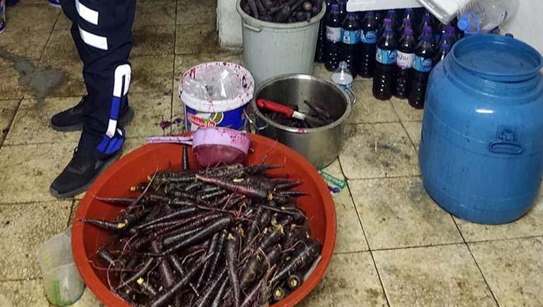 Saray Mahallesi’nde bir iş yerinde besine uygun olmayan ekipmanlar kullanılarak hijyen kurallarına ters şartlarda üretim yapıldığı belirlendi. Şalgam üretim tesisi sıhhatsiz şartlar nedeniyle mühürlendi.