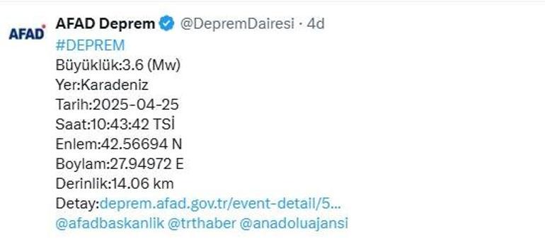 AFAD’dan zelzelelere ait son açıklama Karadeniz’e ait geldi. Saat 10.43’deki sarsıntının büyüklüğü 3.6 olarak aktarılırken, zelzelenin derinliği de 14 kilometre olarak belirtildi.