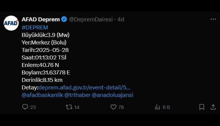 AFAD’ın bilgilerine nazaran; Bolu’nun Merkez ilçesinde saat 01.13’te yerin 8.15 kilometre altında 3.9 büyüklüğünde zelzele meydana geldi.