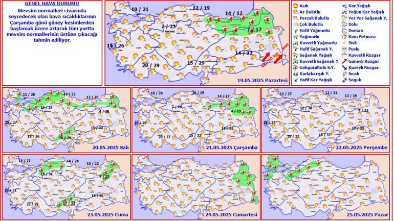 Meteoroloji Genel Müdürlüğü’nün önümüzdeki hafta hava kestirimine nazaran, Türkiye genelinde sıcaklıkların evvel mevsim normallerinde seyredeceği, fakat Çarşamba gününden itibaren güney bölümlerden başlayarak tüm yurtta mevsim normallerinin üzerine çıkacağı öngörülüyor. Bilhassa 21 Mayıs Çarşamba günü birtakım bölgelerde gündüz sıcaklıklarının 36°C’ye kadar yükselmesi beklenirken, gece ve gündüz ortasındaki sıcaklık farklarının da dikkat alımlı olduğu görülüyor. Bu durum, ani sıcaklık değişimlerine karşı vatandaşların önlemli olması gerektiğini ortaya koyuyor.