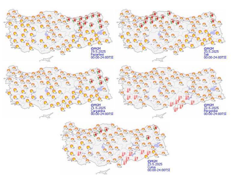 Hafta boyunca bölgesel farklılıklar dikkat çekiyor. Cuma günü batı kısımlarda 15-31°C aralığında seyreden sıcaklıklar, iç ve doğu bölgelerde 16-33°C’ye kadar çıkabiliyor. Cumartesi günü ise sıcaklıkların bilhassa güney ve iç bölümlerde 17-36°C ortasında değişmesi bekleniyor.
