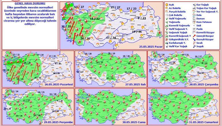Meteoroloji Genel Müdürlüğü hava iddia raporuna nazaran, bu hafta başından itibaren ülke genelinde mevsim normallerinin üzerinde seyreden hava sıcaklıklarında azalma bekleniyor. Bilhassa batı ve iç bölgelerde sıcaklıkların mevsim normalleri civarına, yer yer altına düşeceği kestirim ediliyor. Raporda kuvvetli sağanak yağışlar ve kuzeyli rüzgarların tesirli olacağı dikkat çekiyor. Yarından itibaren yağışlar Marmara, Ege, İç Anadolu ve Karadeniz’in batı kesitlerinde tesirli olacak. Perşembe ve Cuma günlerinde ise yurt genelinde gök gürültülü sağanak yağışlar geniş alana yayılıyor.