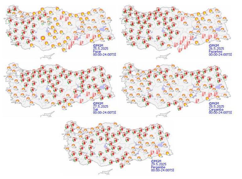 Meteoroloji Genel Müdürlüğü tarafından yapılan varsayımlara nazaran: Ülkemiz genelinin kesimli ve az bulutlu, yer yer çok bulutlu, Marmara, Ege, İç Anadolu’nun batısı ile Burdur, Isparta, Düzce, Bolu, Karabük ve Hakkari etraflarının aralıklı sağanak ve gök gürültülü sağanak yağışlı geçeceği kestirim ediliyor. Yağışların, Trakya, Çanakkale, Balıkesir, İzmir ve Manisa etraflarında mahallî kuvvetli olması bekleniyor. Rüzgarın Ege’de güney ve güneybatı taraflardan kuvvetli (40-60 km/sa) olarak esmesi kestirim ediliyor. Ülkemizin batı ve iç kesitlerinde toz taşınımı görüleceği bekleniyor.