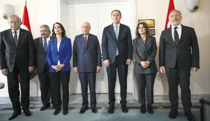 EVRİN GÜVENDİK/ANKARA- Sürpriz biçimde MHP Genel Başkanı Devlet Bahçeli’nin katılımıyla gerçekleşen görüşme yaklaşık 40 dakika sürdü. Bahçeli, Eş Genel Liderler Tülay Hatimoğulları ve Tuncer Bakırhan ile Küme Başkanvekilleri Gülistan Kılıç Koçyiğit ve Sezai Temelli’den oluşan DEM Parti heyetini, TBMM Başkanvekili Celal Adan ve Genel Lider Yardımcısı Feti Yıldız ile birlikte görüşmenin gerçekleşeceği Meclis’teki makam odasının kapısında karşıladı. Bahçeli, görüşmenin ardından da DEM Parti heyetini tekrar kapıda uğurladı. Dünkü ziyaret DEM Parti eş liderleri ve küme başkanvekillerinin Bahçeli’yle birinci görüşmesi niteliğini taşıyor.